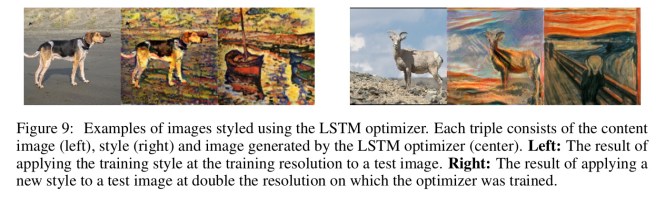 We witnessed a remarkable degree of transfer, with for example the LSTM optimizer trained on 12,288 parameter neural art tasks being able to generalize to tasks with 49,512 parameters, different styles, and different content images all at the same time. We observed similar impressive results when transferring to different architectures in the MNIST task.