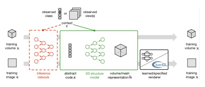 An inference network encodes the observed data into a latent 3D representation, . For training, a generative network recreates (decodes) an image from the learned representation (including the use of an OpenGL renderer in some configurations). We can thus compare the generated image to the original as a measure of how good the learned representation was (autoencoding).