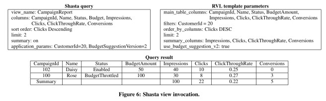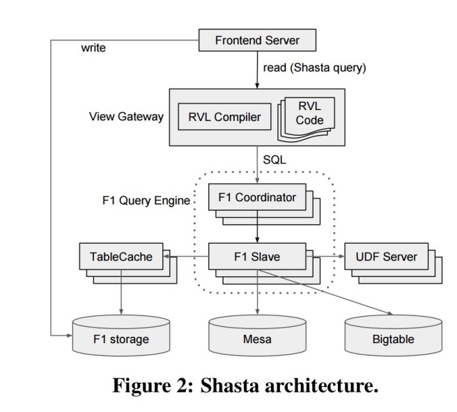 Shasta is the system that Google developed in response to these challenges. At the front-end, Shasta enables developers to define views and express queries in RVL, a new Relational View Language. Shasta translates RVL queries into SQL queries before passing them onto F1. Shasta does not rely on pre-computation, instead a number of optimisations in the underlying data infrastructure enable it to achieve the desired latency targets.