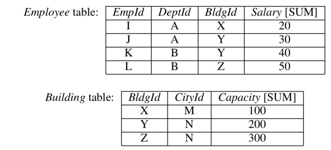 SELECT CityId, SUM(Salary) AS Salary, SUM(Capacity) AS Capacity FROM (SELECT BldgId, SUM(Salary) AS Salary FROM Employee GROUP BY BldgId) LEFT JOIN Building USING (BldgId) GROUP BY CityId;