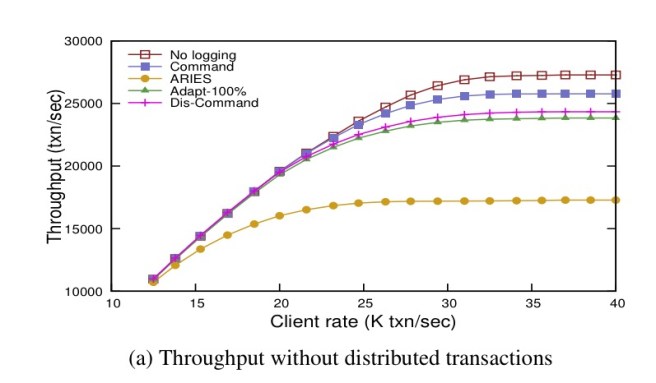 For example, take a look at this graph of TPC-C throughput for single-node transactions where you can see command-logging giving throughput close to no logging at all, and ARIES style logging giving much reduced throughput: