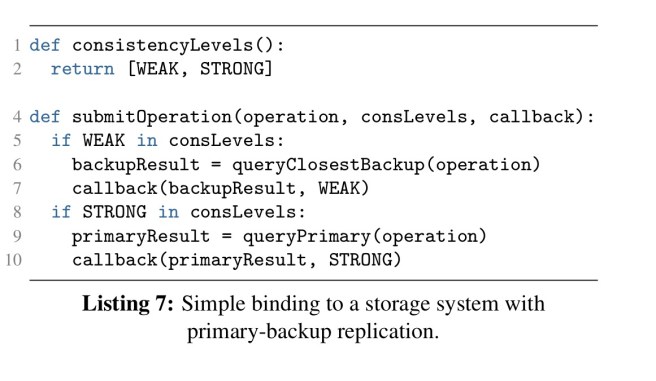 For instance, in Gemini, operations are either Blue (fast, weakly consistent) or Red (slower, strongly consistent). For sensitive data such as passwords, Facebook uses a separate linearizable sub-system. Likewise, Twitter employs strong consistency for “certain sets of operations”, and Google’s Megastore exposes strong guarantees alongside read operation with “inconsistent” semantics. Another frequent form of differentiated guarantees appears when applications bypass caches to ensure correctness for some operations.