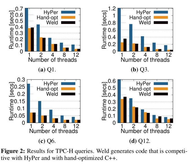 To test the raw speed of the code Weld generates, Weld implementations of a TPC-H workload for SQL, PageRank for graph analytics, and Word2Vec for ML were hand-written and compared against both a hand-optimized C++ version, and also an existing high-performance framework. As an example, here are the TPC-H results for four queries: