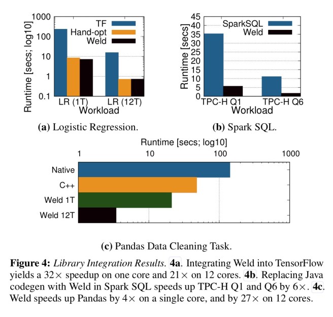 … we have integrated Weld into Spark SQL, NumPy, Pandas, and TensorFlow. Without changing the user APIs of these frameworks, Weld provides speedups of up to 6x for Spark SQL, 32x for TensorFlow, and 30x for Pandas. Moreover, in applications that combine these libraries, cross-library optimization enables speedups of up to 31x.
