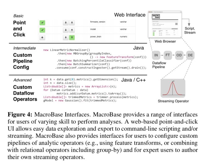 The prioritized computation pieces of MacroBase look to be especially exciting, though what we mostly get here is a teaser for information to be expounded in more depth in a forthcoming SIGMOD 2017 paper.