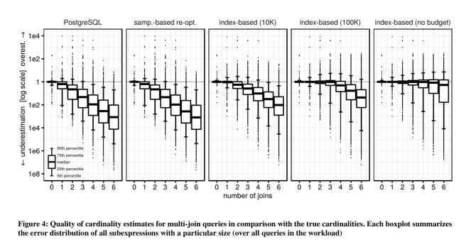 You can see that compared to the PostgreSQL estimates (column 1), index-based sampling with even just 10K samples produces much more accurate estimates. Also note how estimation accuracy decreases with the number of joins. The more samples we have of course, the closer we get to the true cardinalities.