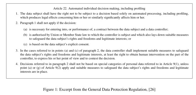 Article 22: Automated individual decision-making, including profiling, potentially prohibits a wide swath of algorithms currently in use in, e.g., recommendation systems, credit and insurance risk assessments, computational advertising, and social networks. This raises important issues that are of particular concern to the machine learning community. In its current form, the GDPR’s requirements could require a complete overhaul of standard and widely used algorithmic techniques.
