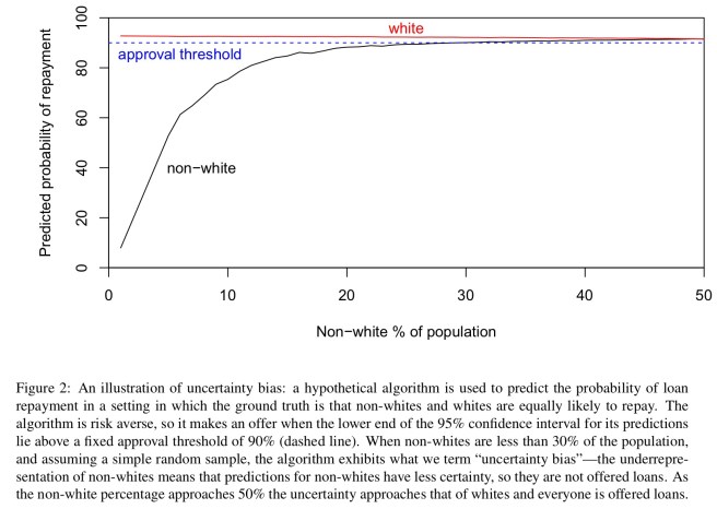 In another example of ‘bias in, bias out’, Goodman and Flaxman provide a thought-provoking example whereby purging variables from the dataset still leaves open a door for unintentional discrimination. They call this uncertainty bias, and it arises under two conditions: