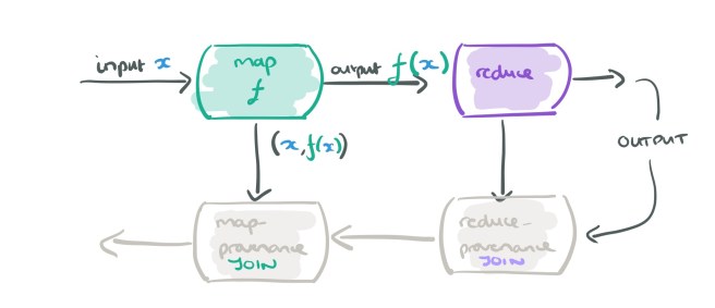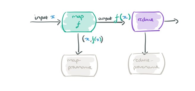 And here comes the clever bit… when we are recording provenance for the map operator, we don’t actually need to record all input, output pairs, we just want those that are needed to explain the ultimate output of the dataflow. Which pairs are they? Just the ones needed to explain the outputs of its downstream operators (i.e., the reduce in this case). So we can feed those into our provenance mapper and do a streaming join.