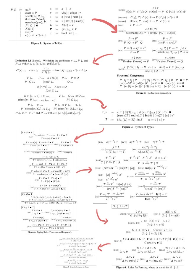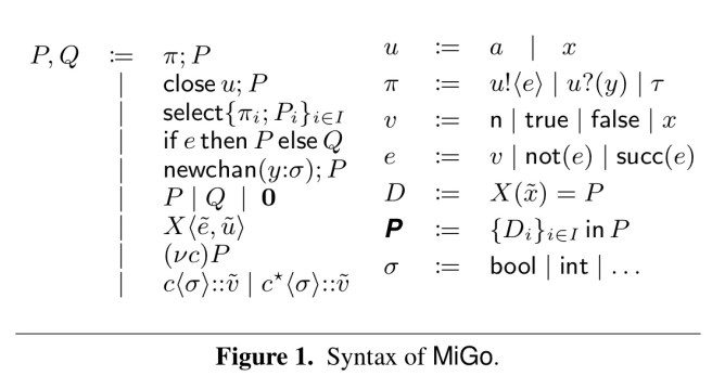 Underpinning these type equations is a language called MiGo (mini-Go) which models the concurrency passing features of Go itself. MiGo uses the familiar ‘!’ and ‘?’ for message send and receive and has the following compact syntax which I present without further explanation in the interests of space: