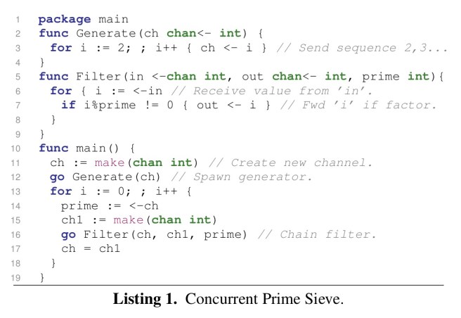 The Go type system can ensure that the values sent and received on channels are of appropriate types, but it cannot give any static guarantees about liveness or safety. Consider the following Go implementation of a concurrent prime sieve. It has several elements making it hard to reason about, including unbounded iteration (L3, 6, 13), dynamic channel creation (L11, 15), and spawning of concurrent threads (L12, 16).