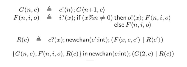 . (Receive a value on channel ‘x’, then spawn a new channel b and behave as a filter process ‘f’ in parallel with ‘r’, both using the new channel ‘b’).