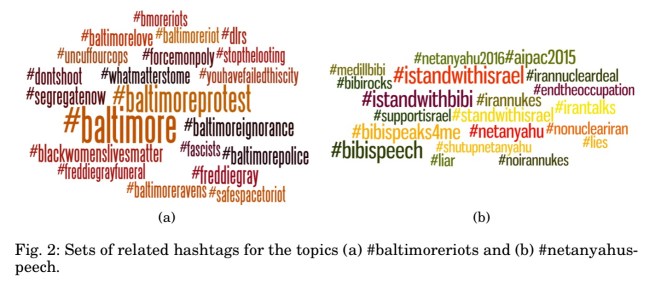 Here are the top-20 hashtag topic clusters for #baltimoreriots and #netanyahuspeech: