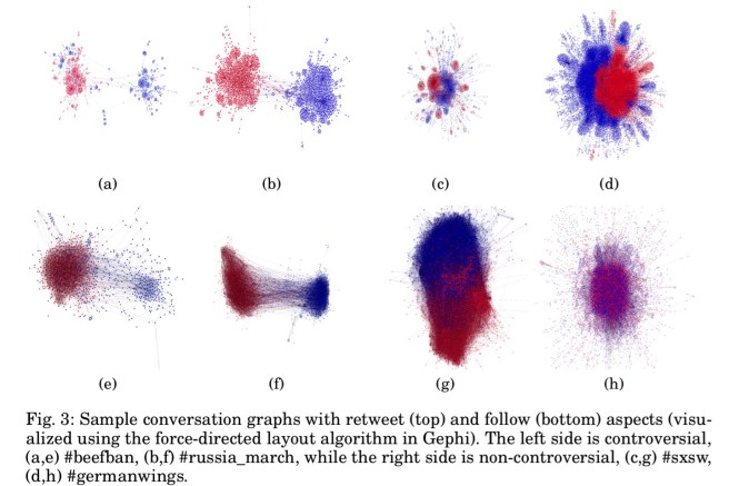 No need to introduce any novelty here. The authors use the standard METIS algorithm and ask it to create two partitions. Here are visualisations of the results for: #beefban, #russia_march (both controversial) and #sxsw and #germanwings (not controversial). The top row shows these partitioned on retweets, and the bottom row by followers, indicating that both of these contribute to the predictive power.