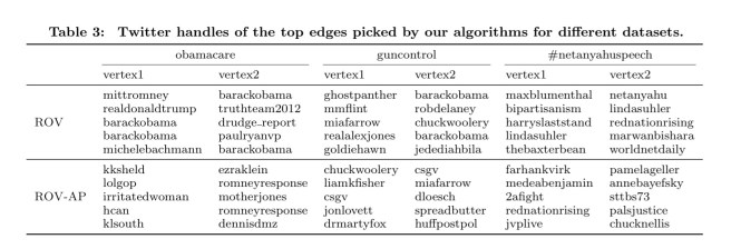 For example, for obamacare ROV recommends edges from mitromney to barackobama, and from barackobama to paulryanvp. Even though these edges indeed connect opposing sides, they might be hard to materialize in the real world. This issue is mitigated by ROV-AP which recommends edges between less popular users, yet connects opposing viewpoints.