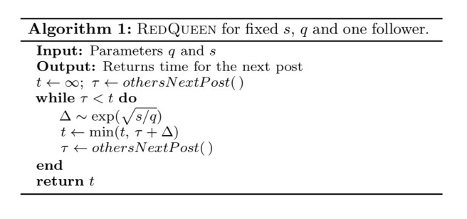 Algorithm 1 summarizes our (sampling) method, which we name RedQueen. Within the algorithm, othersNextPost() returns the time of the next event by other broadcasters in the followers’ feeds, once the event happens. In practice, we only need to know if the event happens before we post. Remarkably, it only needs to sample M(tf) times from a (exponential) distribution (if significance is constant) and requires O(1) space.