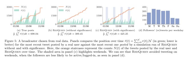 without significance information, RedQueen posts at nearly an even pace. However, when we supply empirically estimated significance, RedQueen avoids tweeting at times the followers are unlikely to be active, i.e., the weekends, denoted by the shaded areas in panel (c) of Figure 5. Due to this, the average position (maximum position) falls from 389.45 (1085.17) to 425.25 (1431.0), but is still lower than 698.04 (2597.9) obtained by the user’s original posting schedule.