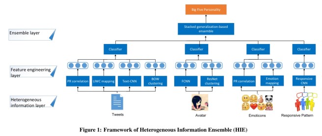 Each of the four basic inputs (tweet text, avatars, emoticons, and response patterns) are fed into their own classifiers which are then combined using a stacked generalization-based ensemble to give the final Big Five personality prediction for a user. The resulting system is called HIE, for Heterogeneous Information Ensemble.