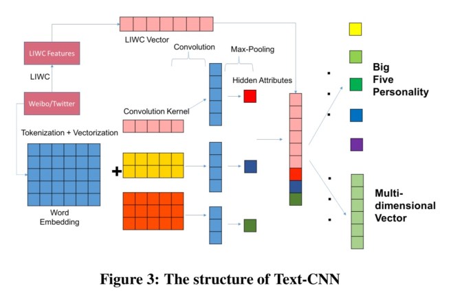- A bag-of-words approach which compensates for “LIWC’s limited capability to represent user’s linguistic patterns in short and informal texts” (i.e., tweets). The top 1,500 (Chinese) words and all punctuation are put in the bag. K-means clustering is then used to cluster the bag-of-words formatted data, and the number of items within each cluster (one cluster per trait) is used as the representation of the user.