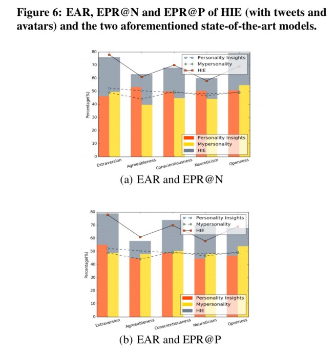 Here’s a look at how well HIE does (when using just tweets and avatars) compared to the state-of-art IBM Watson Personality Insights algorithm and the Mypersonality Facebook application algorithm: