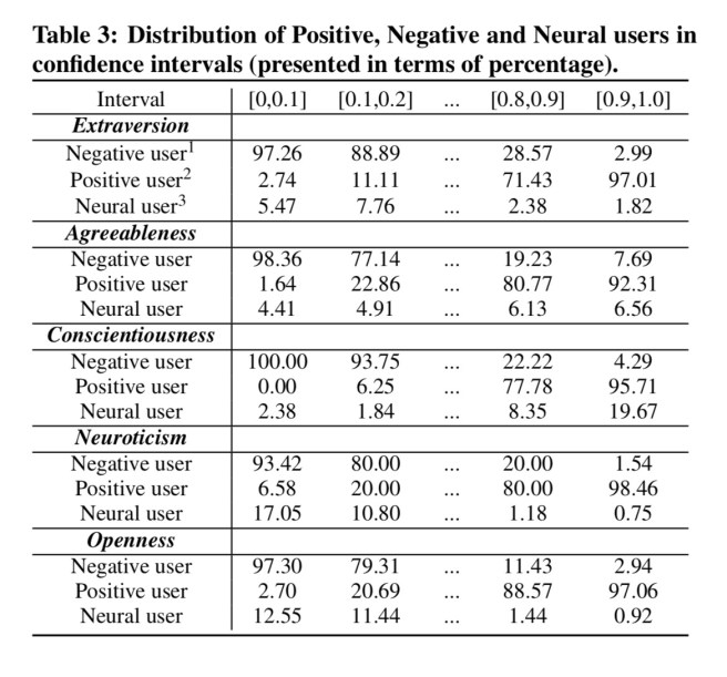 Due to the demands for personalized services, reliability of predicted results is more important than detecting all potential individuals in a specific personality category. HIE perfectly meets this need of real-world usage. Depicted in Table 7.3.3 (below), we notice that users with high probability scores are aggregated in the two ends of the confidence interval. Moreover, users with extremely low scores are on the left end while users with extremely high scores are on the right end. It shows the ability of HIE to accurately distinguish the targeted extreme users from the others.