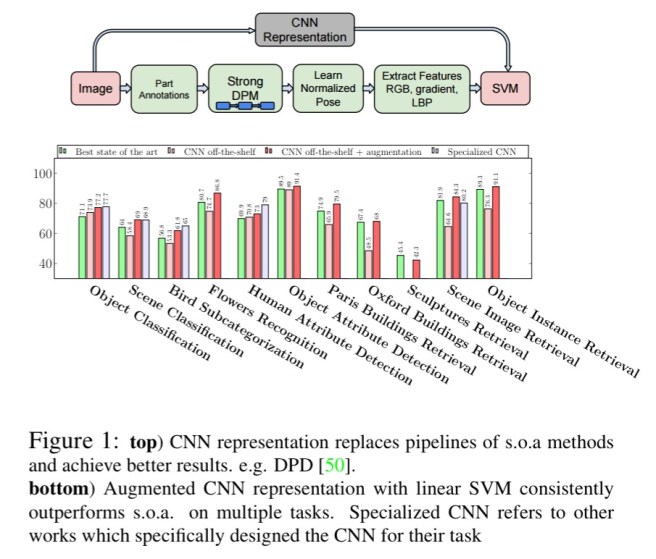 It’s all about the features! SIFT and HOG descriptors produced big performance gains a decade ago and now deep convolutional features are providing a similar breakthrough for recognition. Thus, applying the well-established computer vision procedures on CNN representations should potentially push the reported results even further. In any case, if you develop any new algorithm for a recognition task, it must be compared against the strong baseline of generic deep features + simple classifier.
