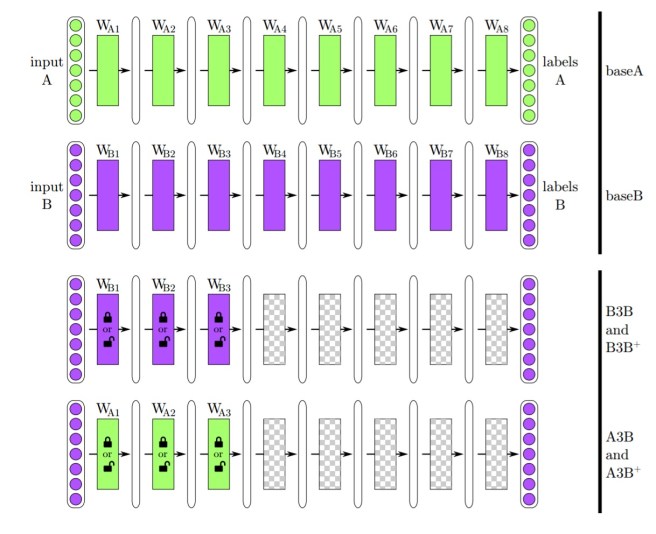 - B3B – the first 3 layers are copied from baseB and frozen. The remaining five higher layers are initialized randomly and we train on task B as a control. (The authors call this a ‘selfer’ network)