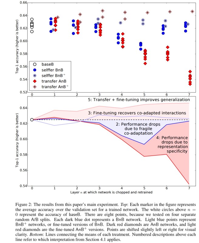Thanks to the BnB points, we can tell that this drop is from a combination of two separate effects: the drop from lost co-adaptation and the drop from features that are less and less general.