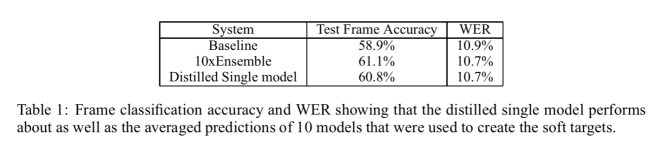 In an Automatic Speech Recognition (ASR) test an ensemble of 10 models was distilled to a single model that performed almost as well. The results compare well to a very strong baseline model similar to that used by Android voice search.