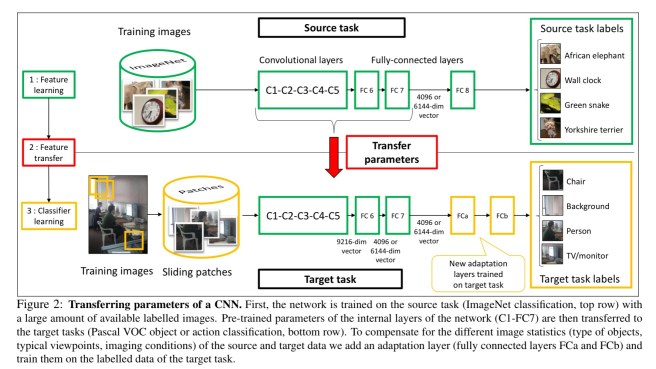 The target task for transfer learning is Pascal VOC object and action classification, “we wish to design a network that will output scores for target categories, or background if none of the categories are present in the image.” Transfer is achieved by removing the last fully-connected layer from the pre-trained network and adding an adaption layer formed of two fully-connected layers.