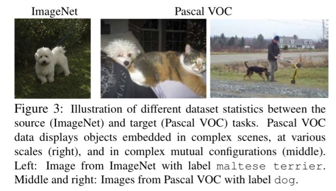 The source dataset (ImageNet) contains nice images of single centered objects. The target dataset (Pascal VOC) contains complex scenes with multiple target objects at various scales and background clutter: