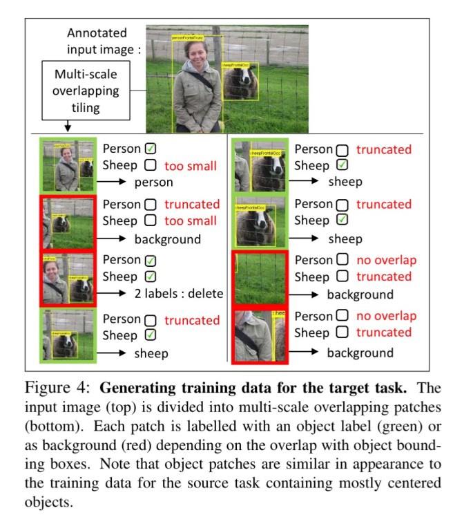 To label the patches in the resulting training data, the authors measure the overlap between the bounding box of a patch P and the ground truth bounding boxes of annotated objects in the image. If there is sufficient overlap with a given class, the patch is labelled as a positive training example for the class.