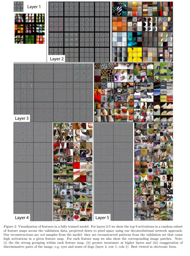 Now that we can project from any layer back onto pixels, we can get a peek into what they seem to be learning. This leads to now-familiar pictures such as this: