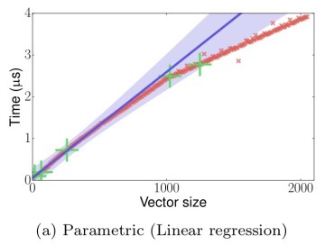 Consider a model predicting the time it takes to insert an element into a sorted vector. Imagine that so far we have taken five observations. If we are using a parametric model such as linear regression, we’ll try to fit a straight line, resulting in underfitting: