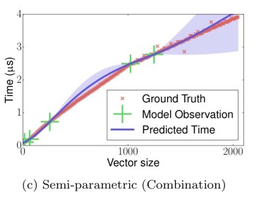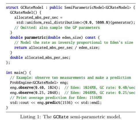 When using the model in BOAT, we collected the true value of these statistics from the GC logs after each evaluation and used them for inference. Further, we declared how we believed each of the three model components behaved as a function of their inputs. For example, we noticed the rate of minor collections was inversely proportional to the size of the eden memory region in the JVM-heap, which is where objects are initially allocated. This intuition was included in the corresponding model by building a semi-parametric model, which can successfully combine a user-defined trend with empirical data.
