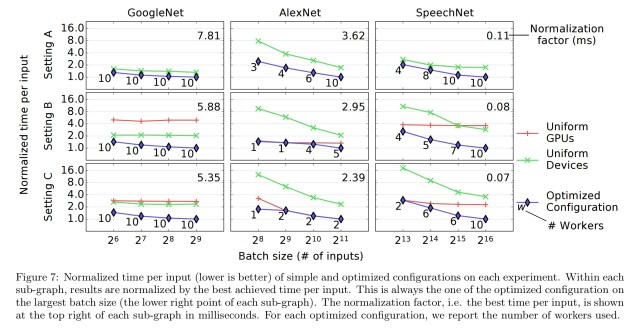 Our tuner takes as input a neural network architecture, a set of available machines and a batch size. It then performs ten iterations, each time evaluating a distributed configuration, before returning the one with highest performance. The tuning always finishes within two hours which is small compared to the typical training time of neural networks.
