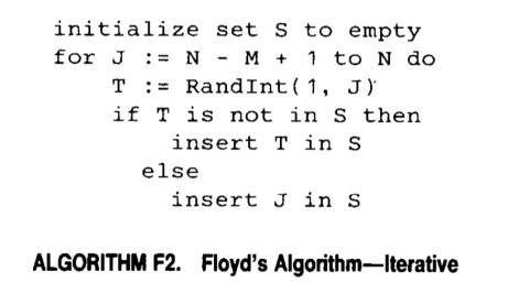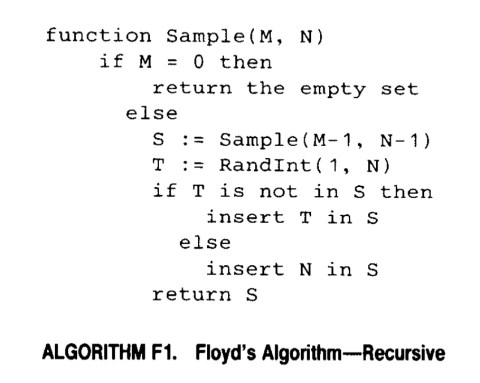 We can appreciate the correctness of Floyd’s algorithm anecdotally. When M=5 and N=10, the algorithm first recursively computes in S a 4-element random sample from 1..9. Next it assigns to T a random integer in the range 1..10. Of the 10 values that T can assume, exactly 5 result in inserting 10 into S: the four values already in S, and the value 10 itself. Thus element 10 is inserted into the set with the correct probability of 5/10.