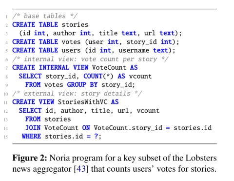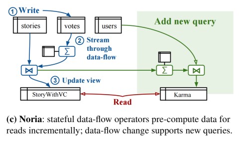 One very nice feature of Noria is that it accepts the fact that application queries and schema evolve over time. Noria plans the changes needed to the data-flow graph to support the changes and transitions the application with no downtime.