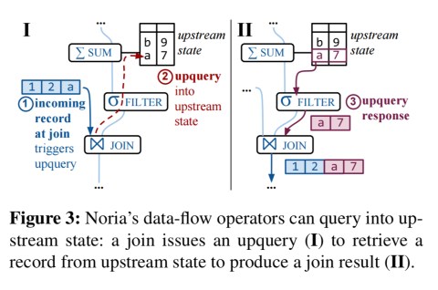 Upqueries require special care since upquery responses don’t commute with each other or with previous updates. Noria handles this by ensuring that no updates are in flight between the upstream stateful operator and the join when a join upquery occurs: each join upquery is scoped to an operator chain processed by a single thread. (Updates on other chains can be processed in parallel).