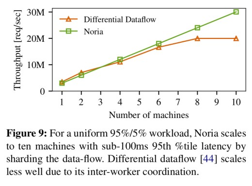 Compared to a Differential Dataflow implementation based on Naiad and a 95% read Lobsters subset workload, Noria scales competitively and starts to show advantage from 4 machines onwards.