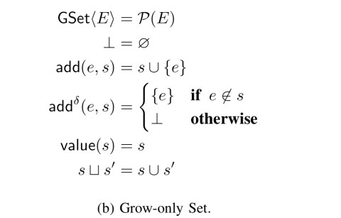 To bring all this to life we need a couple of examples. The paper uses grow-only CRDT counters and grow-only sets. State-based CRDTs are based upon a join semi-lattice, , a set of mutators that update that state, and a binary join operator