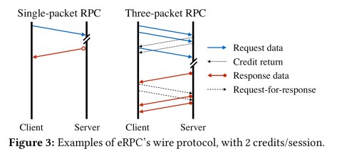 We designed a wire protocol for eRPC that is optimized for small RPCs and accounts for per-session credit limits. For simplicity, we chose a simple client-driven protocol, meaning that each packet sent by the server is in response to a client packet.