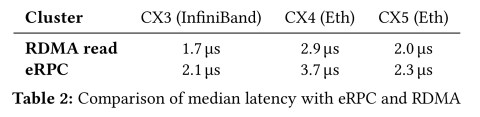 eRPC’s median latency on CX5 is only 2.3µs, showing that latency with commodity Ethernet NICs and software networking is much lower than the widely-believed value of 10-100µs.