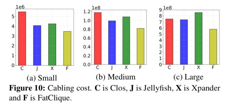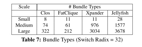 We find that FatClique is the best at most scales by all our complexity metrics. (The one exception is that at small and medium scales, Clos has slightly fewer patch panels). It uses 50% fewer switches and 33% fewer patch panels than Clos at large scale, and has a 23% lower cabling cost (an estimate we were able to derive from published cable prices). Finally, FatClique can permit fast expansion while degrading network capacity by small amounts (2.5-10%): at these levels, Clos can take 5x longer to expand the topology, and each step of Clos expansion can take longer than FatClique because the number of links to be rewired at each step per patch panel can be 30-50% higher.