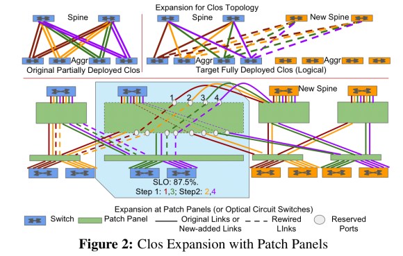 When you want to expand an existing network first you need to buy all the new gear and lay it out on the datacenter floor, and then you can begin a re-wiring process. This is all going on with live traffic flowing, so expansion is carried out in steps. During each step the capacity of the topology is guaranteed to be at least some percentage of the existing topology capacity. The percentage is sometimes known as the expansion SLO.