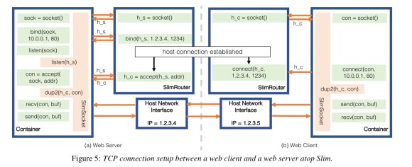 Slim virtualizes the network by manipulating connection-level metadata. SlimSocket exposes the POSIX socket interface to application binaries to intercept invocations of socket-related system calls. When SlimSocket detects an application is trying to set up a connection, it sends a request to SlimRouter. After SlimRouter sets up the network connection, it passes access to the connection as a file descriptor to the process inside the container. The application inside the container then uses the host namespace file descriptor to send/receive packets directly to/from the host network. Because SlimSocket has the exact same interface as the POSIX socket, and Slim dynamically links SlimSocket into the application, the application binary need not be modified.