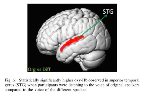 When comparing the neural activation in the brain between original speaker speech samples and the morphed voice impersonating that speaker, no statistically significant differences were observed. At this point you might be thinking “perhaps the experiment just didn’t monitor the part of the brain where the difference shows” (I certainly was). And that’s still a possibility. However, comparing the neural activation between an original speaker speech sample and a different voice impersonating the speaker did show statistically significant differences. I.e., the probes were at least measuring brain activity in some of the areas that matter!