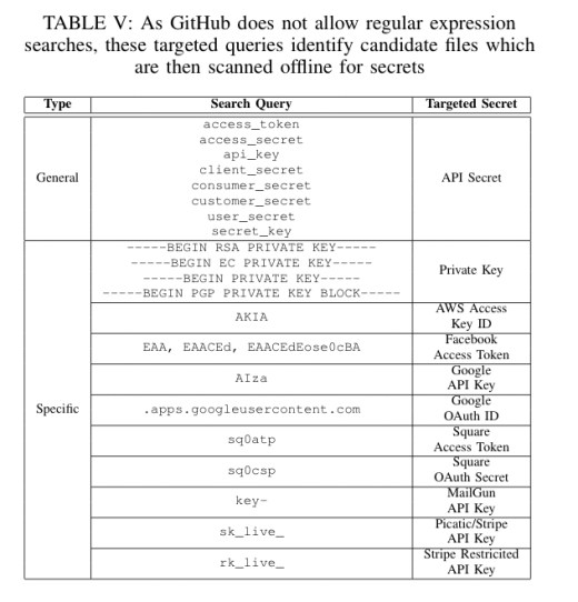 The regular expressions can then be used to scan the candidate files from the first phase, with any matches considered “candidate secrets”. These candidate secrets are then passed through a set of filters designed to reduce false negatives. For example, the key pattern “AKIAXXXEXAMPLEKEYXXX” as used perhaps in a test case, would be filtered out at this stage. The set of keys that pass through these filters are considered to be true leaked secrets. The authors manually verified a random sample of keys and from this process estimated that 89.1% of all discovered secrets truly are sensitive.