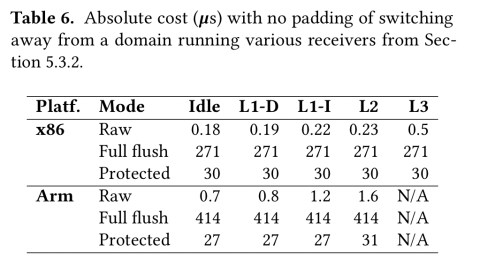 Time protection is obviously at the mercy of hardware, and not all hardware provides sufficient support for full temporal isolation. We have seen this with the x86 L2 channel in Table 3, which we could not close… The results reinforce the need for a new, security-oriented hardware-software contract…: