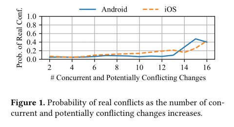 Here’s 9 months of data for the Uber iOS and Android repos, showing the probability of conflicts as the number of concurrent changes increases: